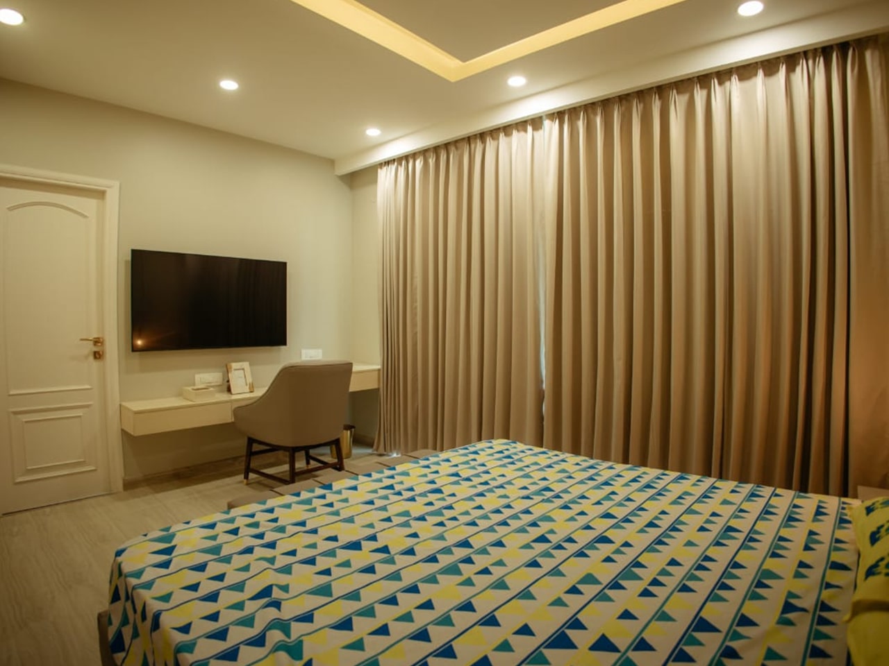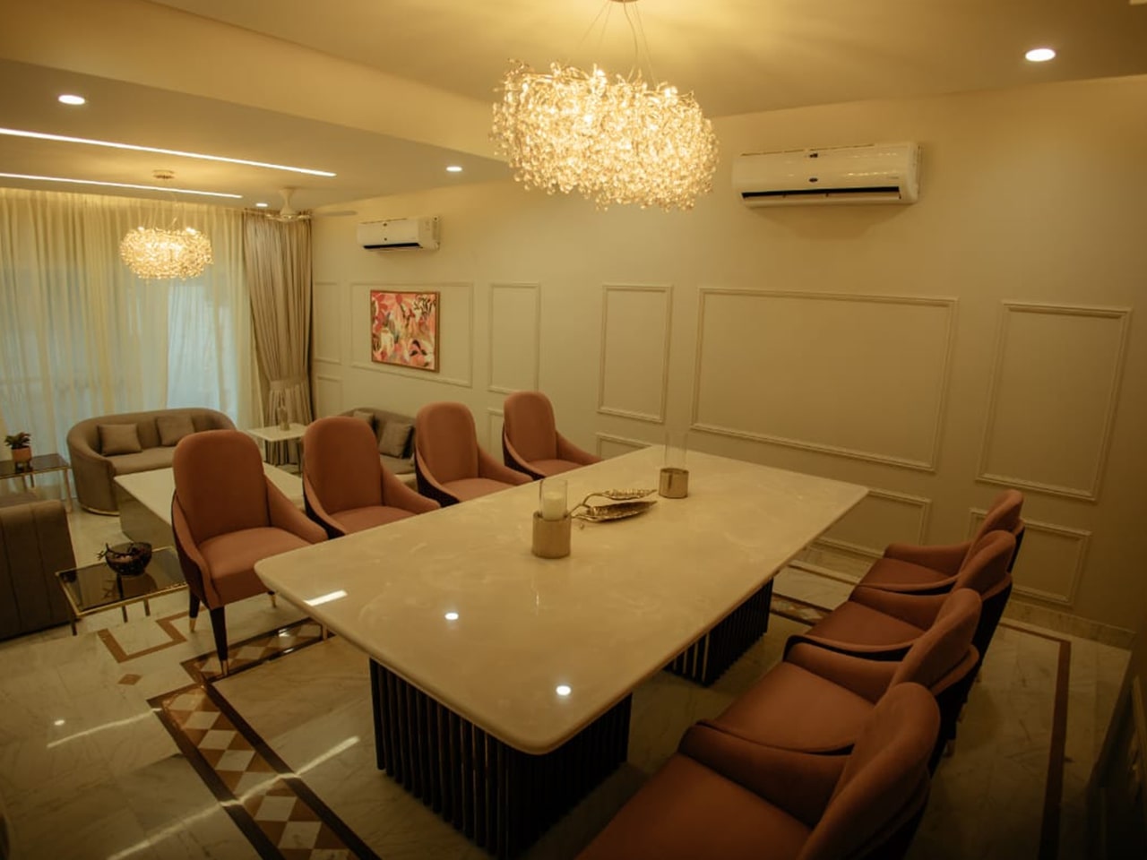 For those requiring even more space, our 3BHK serviced apartment in Kalkaji provides a luxurious and spacious environment, perfect for larger families or groups. The expansive living area is tastefully decorated with high-end furnishings and features an open-plan design. This apartment includes three spacious bedrooms with king-size beds and high-quality linens, and three modern bathrooms with premium fittings, including an en-suite in the master bedroom. The gourmet kitchen boasts top-of-the-line appliances. Additional amenities include air conditioning, high-speed Wi-Fi and daily housekeeping. Guests also receive a complimentary welcome pack and benefit from 24/7 security, with full access to on-site amenities such as a private garden and fitness center.